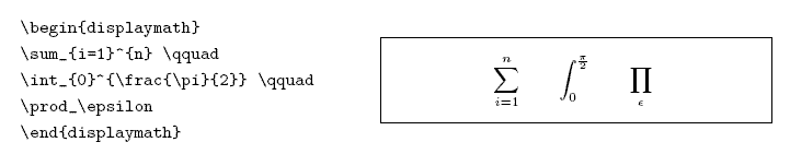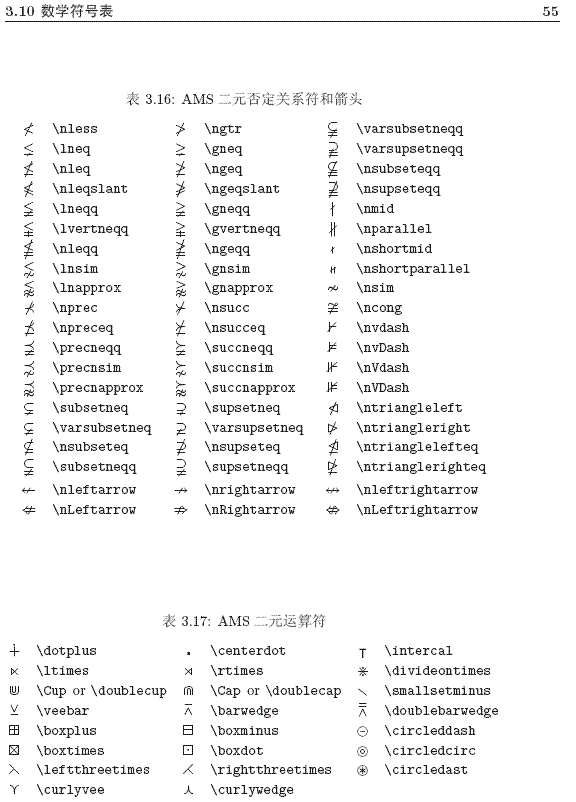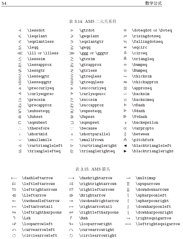 2、平方根(square root)的输入命令为:\sqrt,n 次方根相应地为: \sqrt[n]。方根符号的大小由LATEX自动加以调整。也可用\surd 仅给出符号。比如: 3、命令\overline 和\underline 在表达式的上、下方画出水平线。比如: 4、命令\overbrace 和\underbrace 在表达式的上、下方给出一水平的大括号。 5、向量(Vectors)通常用上方有小箭头(arrow symbols)的变量表示。这可由\vec 得到。另两个命令\overrightarrow 和\overleftarrow在定义从A 到B 的向量时非常有用。 6、分数(fraction)使用\frac{...}{...} 排版。一般来说,1/2 这种形式更受欢迎,因为对于少量的分式,它看起来更好些。 7、积分运算符(integral operator)用\int 来生成。求和运算符(sum operator)由\sum 生成。乘积运算符(product operator)由\prod 生成。上限和下限用^ 和_来生成,类似于上标和下标。 以下提供一些常用符号的表示方法 |